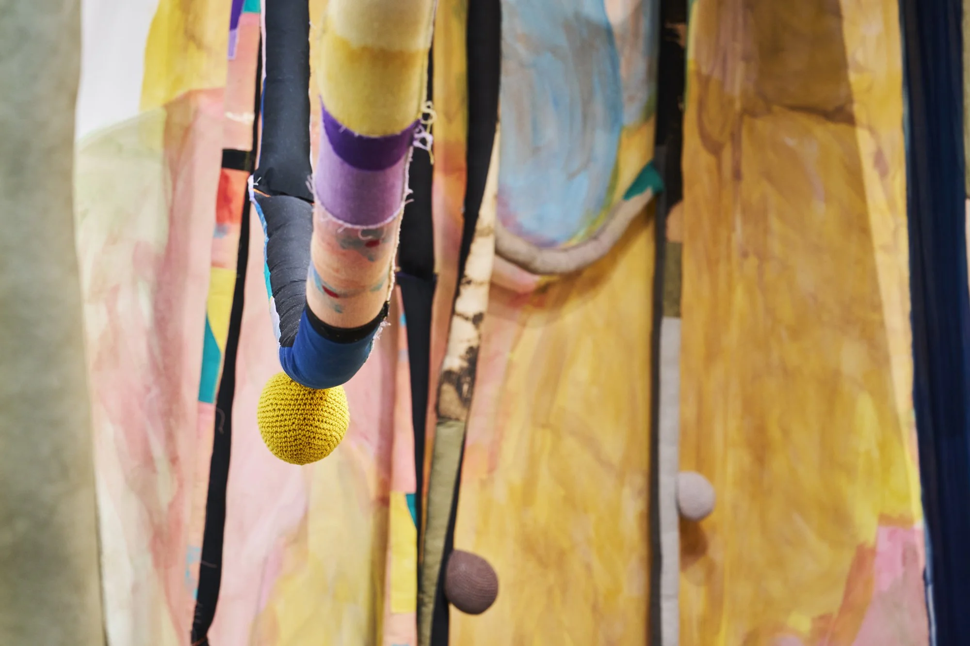 Groundwork is a collaborative artwork made with emerging artist Saskia Van Pagee Anderson. Conceived of as an immersive soft sculpture garden, the work celebrates sustained research into plant dyed textiles and vegetal forms and revolves around a shared attentivness to the enigmatic world of plants. Working together as settlers on Djaara Country the lands of the Dja Dja Wurrung, this installation emerged from a process of collaborative intergenerational practice-led research made in response to place and the vegetal beings we co-habitat with.