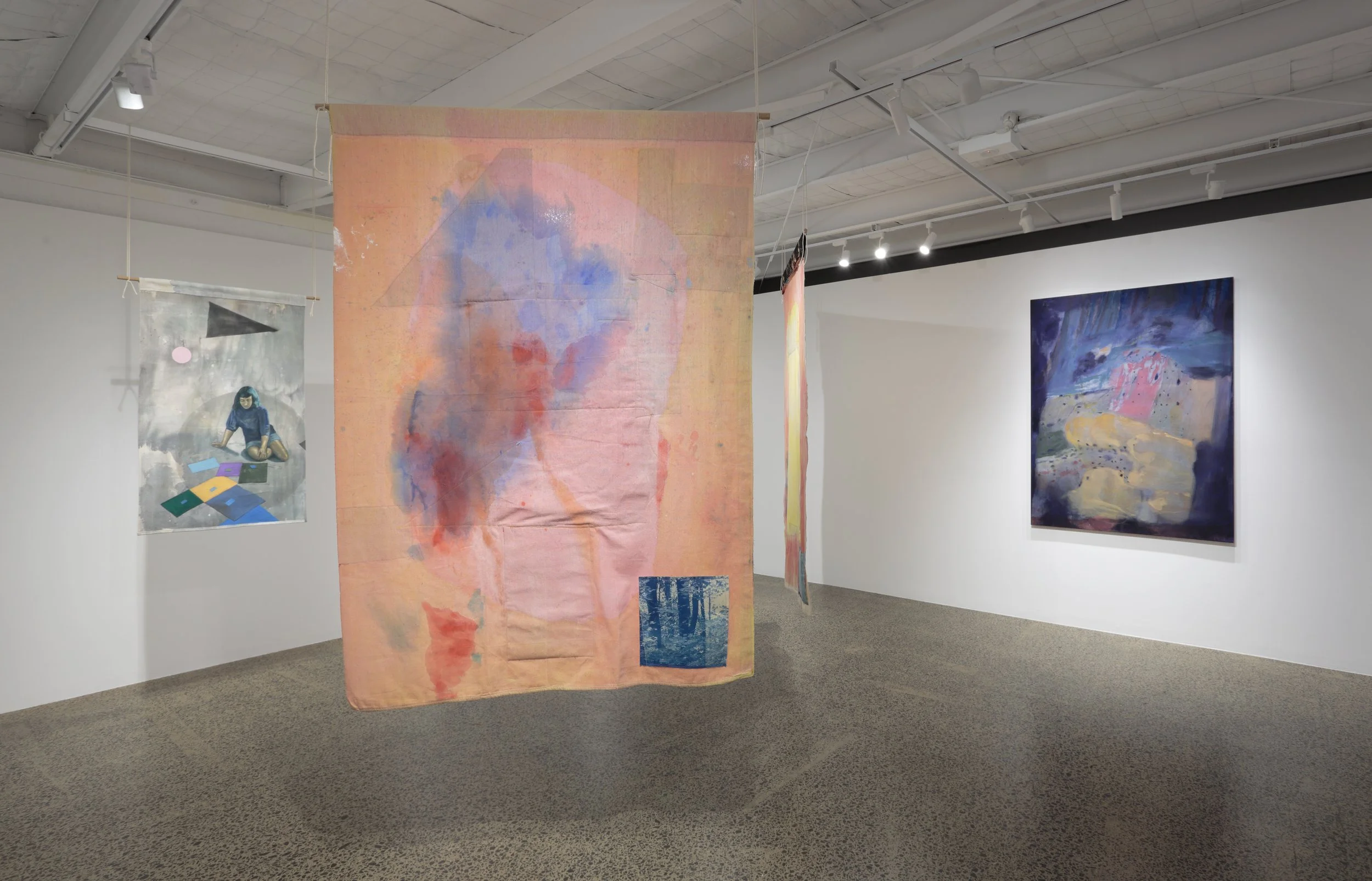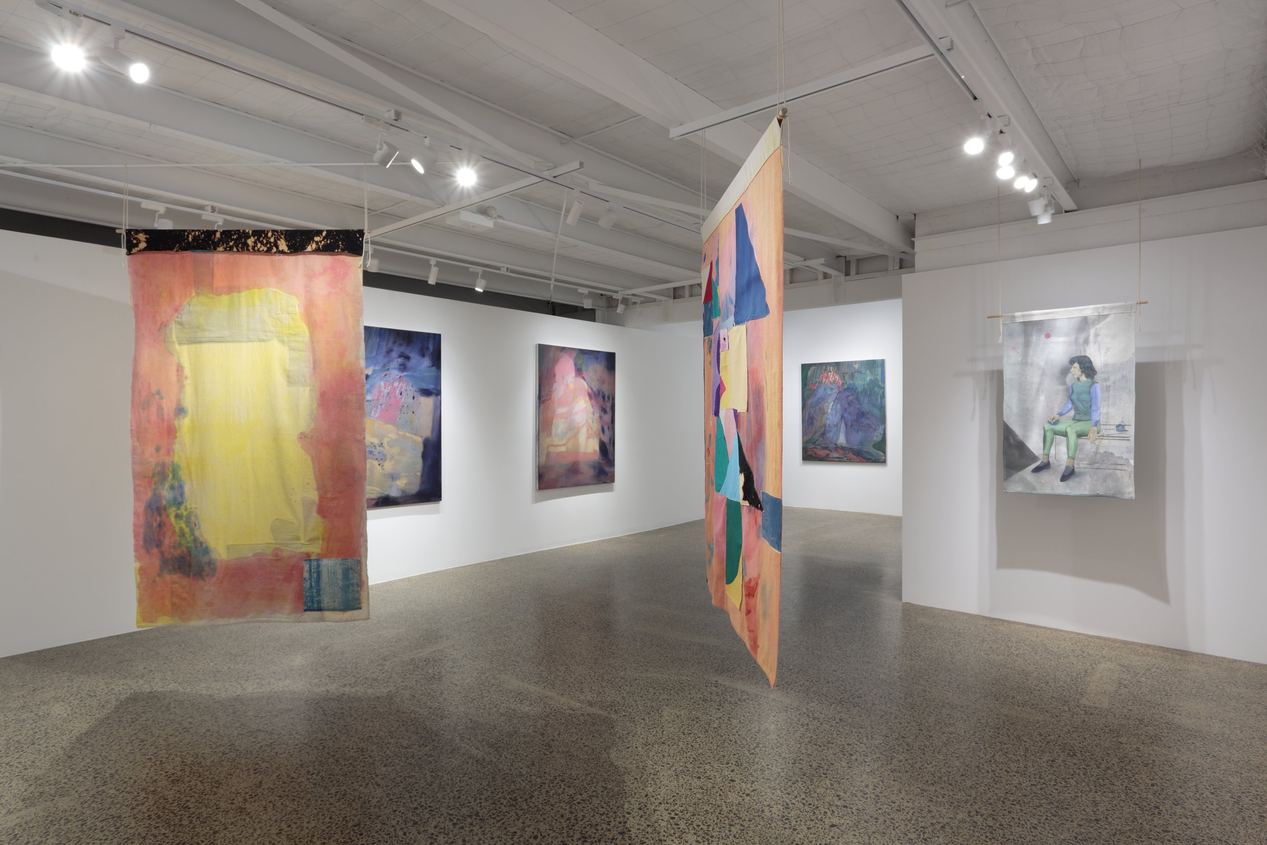 In Banyard’s work, canvas (the heroic material that was used by American Abstract Expressionists as a field for colour and form and expanded to macho proportions) connects the work to the history of painting. However, the material also links to the feminine. The large spans of fabric connote the American tradition of quilting and ‘women’s craft’.